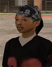 Denise Robinson is one of two storyline girlfriends in San Andreas. She is the first girlfriend CJ gets in the game after he rescues her from a burning house fire in the mission "Burning Desire". When CJ goes out with Denise, she likes to stay local and to do drive-bys on the way. She says that she had three kids but put them up for adoption. Denise is aligned with the Grove Street Families but does not wear green. She does a shout out on Radio Los Santos in which she says that she is "desperate" for CJ's attention. She is also a playable character in the multiplayer on Xbox and PS2.